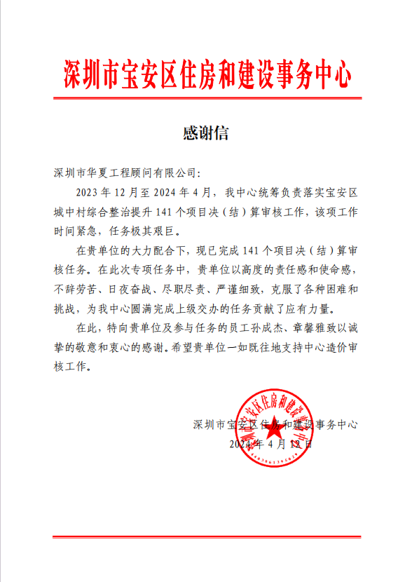 深圳市寶安住房和建設(shè)事務(wù)中心感謝信