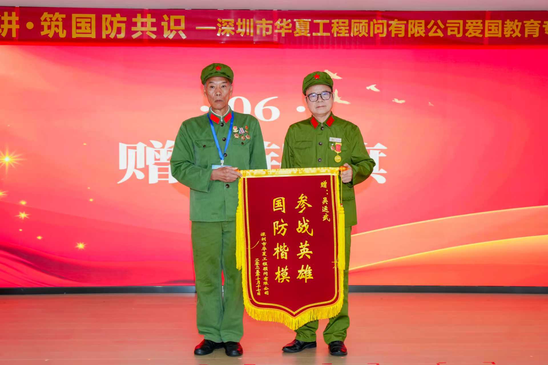 “參戰(zhàn)英雄,國防楷模”——鮮紅的錦旗上,八個大字熠熠生輝。董事長親手將錦旗贈予吳運武同志,這不僅是對一位參戰(zhàn)老兵的最高褒獎,更是華夏工程顧問有限公司對國防精神的堅定追隨。